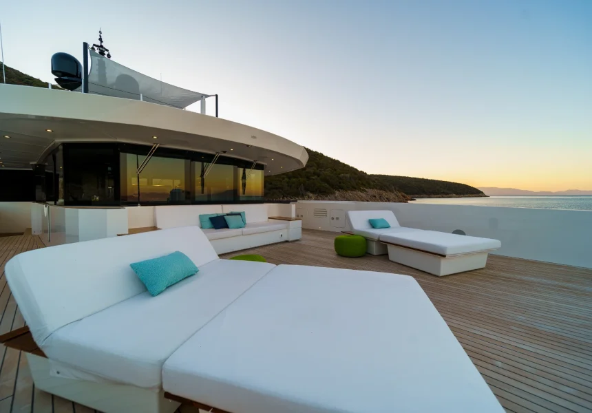 Another highlight of this yacht is the sundeck, a very spacious area with sunbathing options throughout. There is a BBQ hidden in the portside superstructure of the sundeck, enabling your Michelin-level chef to prepare show-cooking alfresco extravaganzas for the entire charter party. The crown jewel of the sundeck is definitely the glass-bottom jacuzzi, which fits 8 adult guests.